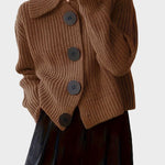 • Artesanato e material: Tricot grosso em canelado numa profunda nuance de castanho cacau, suportado por uma gola bem definida e botões marcantes que sinalizam qualidade.