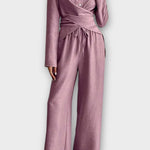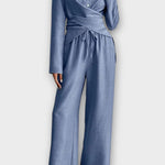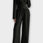 • Ajuste e silhueta: Top descontraído e calças de perna larga, que proporcionam liberdade de movimento e uma silhueta lisonjeira.