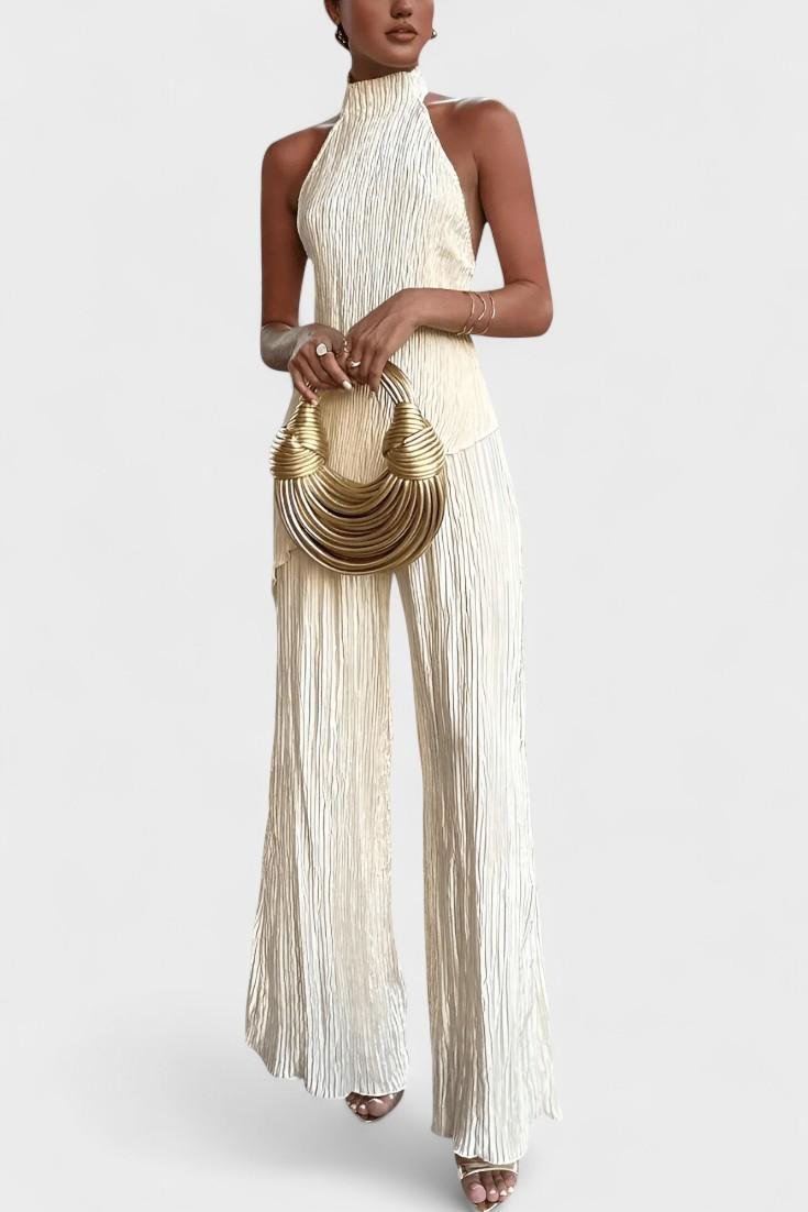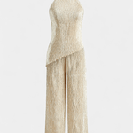 • Design: Top assimétrico de halterneck com costas abertas e gola alta, combinado com calças longas e largas.