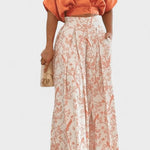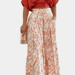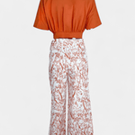 • Silhueta e movimento: O top com decote em V valoriza as contornos femininos, enquanto as pernas largas criam uma silhueta fluida.