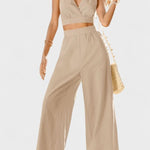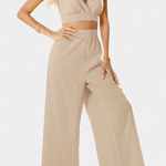 • Silhueta e design: O profundo decote em V, as alças finas e as calças largas criam uma silhueta fluida e sofisticada, adequada para eventos diurnos e noturnos.