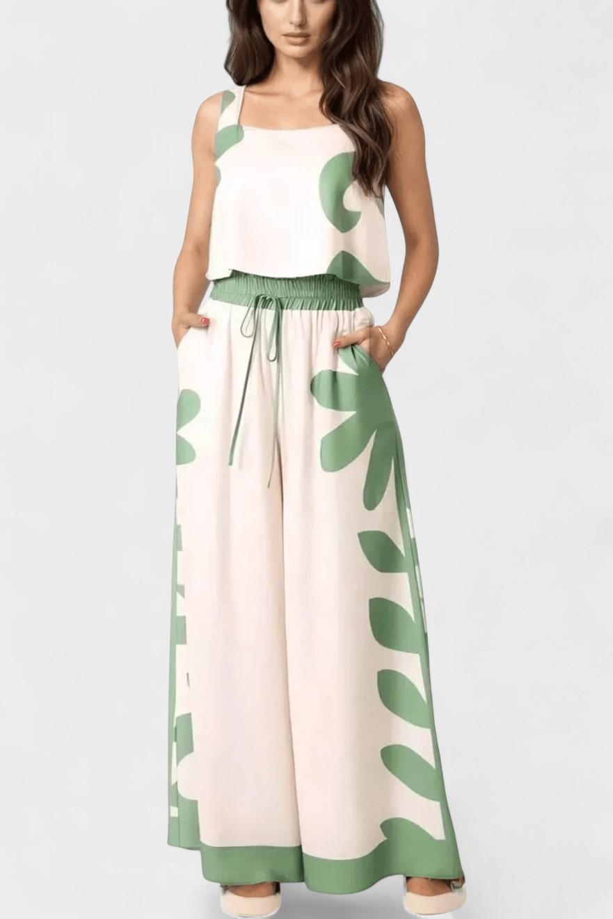 • Silhueta e movimento: Blusa sem mangas e calças largas criam uma silhueta leve e drapeada que acompanha os seus movimentos.