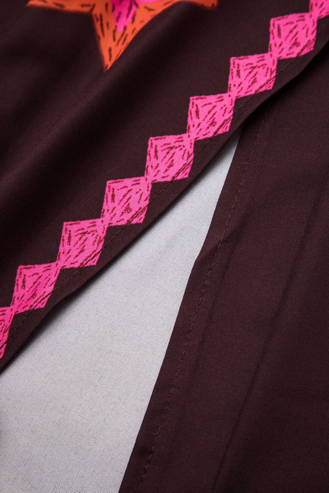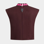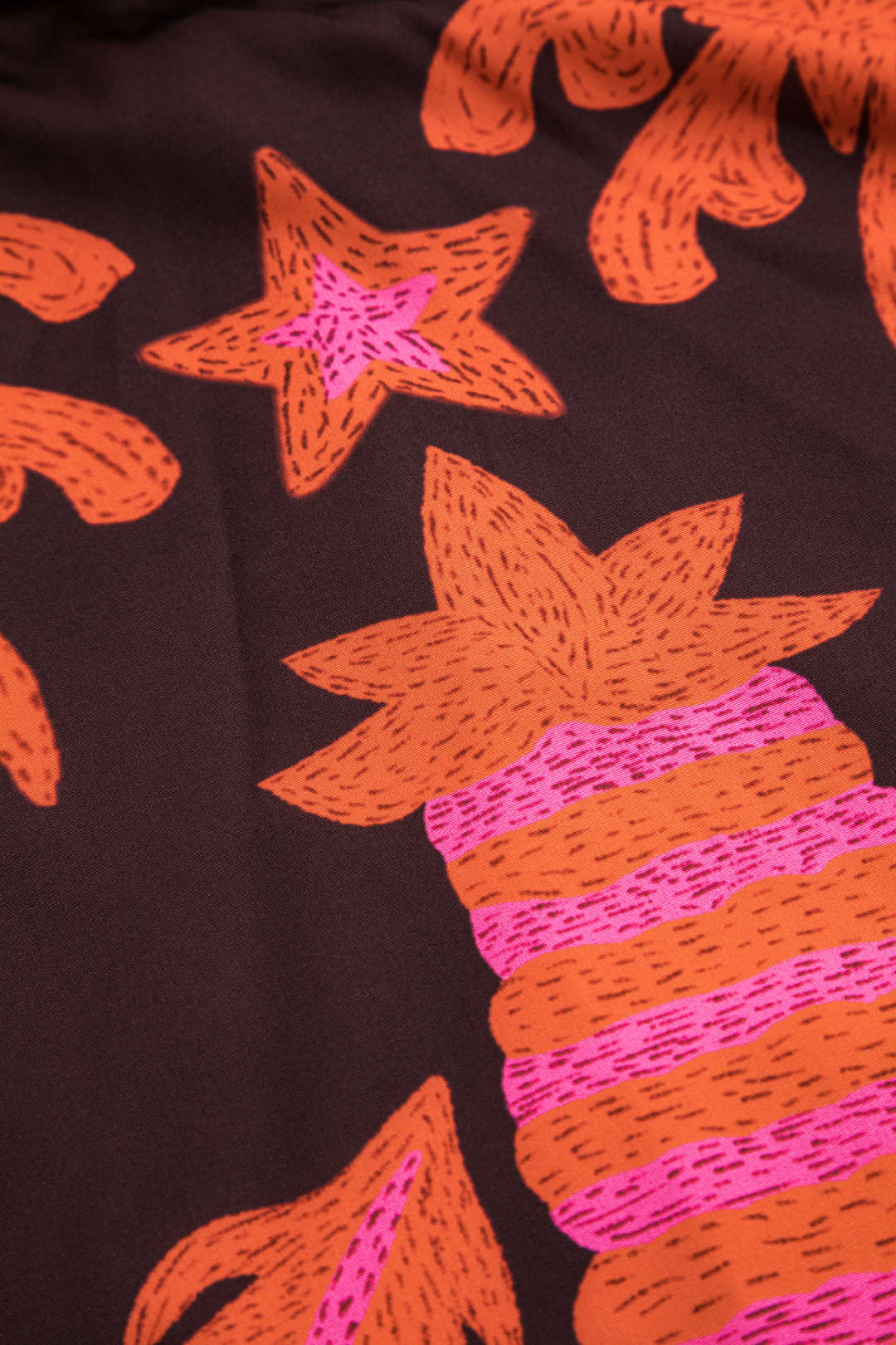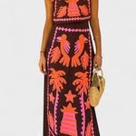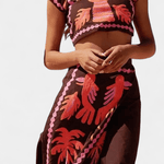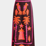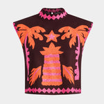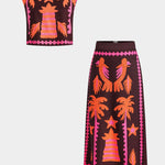 Sloan | Conjunto exala luxo intemporal ao unir charme tropical com requinte moderno. O conjunto Vibeke | Sloan apresenta um top cropped com estampa de palmeiras e um colarinho alto, acompanhado de uma saia midi de cintura alta, que juntos formam uma silhueta sofisticada. Os bordados meticulosamente elaborados em cores vibrantes – palmeiras, estrelas e aves tropicais – testemunham a qualidade do artesanato e um legado que permite uma longa durabilidade na coleção.