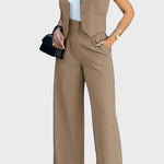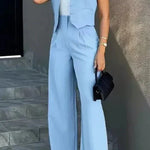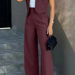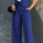 • Silhueta e ajuste – O destaque na cintura do colete e as calças largas criam uma silhueta equilibrada e lisonjeira.