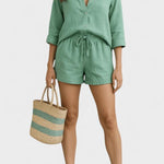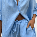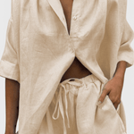 Anika | Conjunto irradia luxo discreto e veranil, bem como a herança intemporal do artesanato. O conjunto é composto por uma camisa com botões e calções leves numa mistura de algodão leve, que garante respirabilidade, leveza e um controlo de temperatura confortável nos meses quentes. O acabamento sem necessidade de passar a ferro torna a manutenção simples, enquanto o corte ajustável assegura conforto durante todo o dia. O design minimalista adapta-se tanto a um estilo em camadas como a um visual de verão limpo, e os materiais são cuidadosamente selecionados pela sua qualidade e durabilidade. Produzido em pequenas quantidades para preservar a importância artesanal e a exclusividade, Anika oferece um apelo intemporal que pode ser herdado e completar um guarda-roupa orientado para a qualidade.