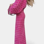 Ella | Conjunto Tweed representa uma interpretação sofisticada da elegância intemporal, onde o corte francês encontra um espírito moderno e forte. O conjunto é composto por uma jaqueta estruturada e uma saia em A em fino tweed xadrez, cujo artesanato se revela através de cortes bem elaborados e materiais de alta qualidade, que testemunham herança e atenção ao detalhe. O clássico padrão xadrez é intemporal e versátil, tornando Ella um investimento que é usado ano após ano, sinalizando confiança e bom gosto em reuniões de negócios, chás da tarde exclusivos e eventos especiais.