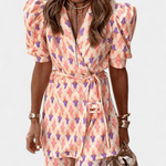• Jaqueta wrap multicolorida com mangas bufantes e um cinto ajustável, que cria uma cintura elegante e uma silhueta refinada.