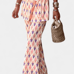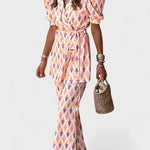 Ellen | Conjunto apresenta o conjunto Araceli e exala um artesanato de classe mundial, assim como um estilo pessoal e colorido. A jaqueta estruturada tipo wrap com mangas bufantes e o cinto ajustável criam uma cintura elegante e uma silhueta refinada, enquanto a palete multicolorida adiciona energia sem comprometer a atemporalidade. Os materiais foram escolhidos pela sua suavidade e durabilidade, e a produção é realizada em número limitado, conferindo uma exclusividade discreta e apelo para colecionadores. A parte das calças apresenta uma cintura alta e pernas largas, cuja silhueta inspirada no retro confere a cada passo uma elegância atemporal. Este conjunto foi desenhado para durar ao longo das temporadas e combina especialmente bem com espadrilhas, óculos de sol e joias douradas para um look urbano, inspirado no Mediterrâneo.