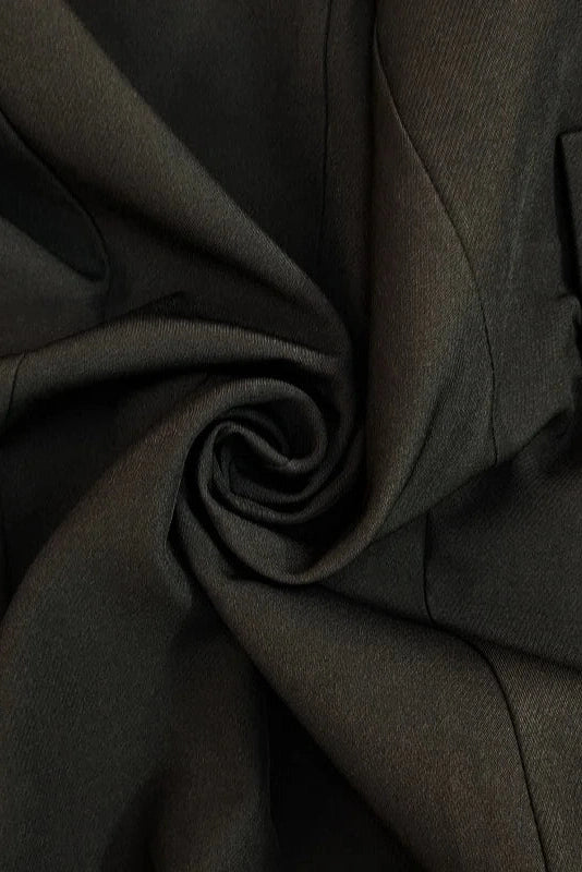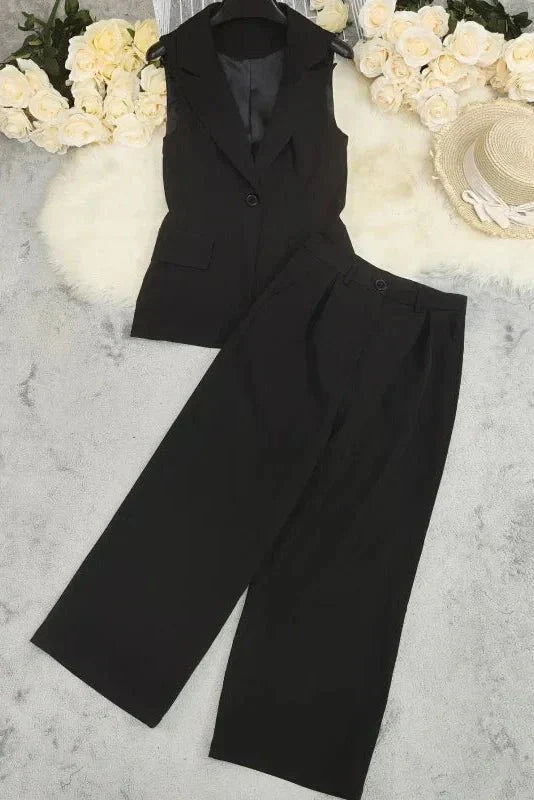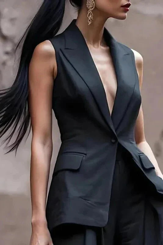 Maja | O Conjunto Luxuoso Ravenna Costumiza marca o culminar da arte e da herança. O colete sem mangas, bem cortado, juntamente com as calças largas, cria uma silhueta que é ao mesmo tempo moderna e intemporal, numa profunda nuance de preto que emana uma elegância discreta. O tecido estruturado e respirável assegura um ajuste preciso e conforto durante todo o dia, enquanto a qualidade dos materiais e a arte refletem uma longa durabilidade e um valor duradouro. Como uma edição limitada exclusiva, o fato Ravenna é uma verdadeira peça de colecionador, que acrescenta à guarda-roupa qualidade intemporal e um apelo versátil para o escritório, jantares e noites. O sofisticado colete sob medida destaca a cintura e equilibra a ampla silhueta das calças, sublinhando a sensação moderna e intemporal do conjunto.
