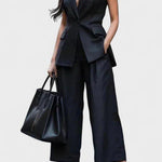 • Colete sob medida destaca a cintura e equilibra a ampla silhueta das calças para uma silhueta sofisticada.