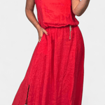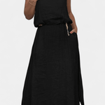 • Silhueta e detalhes: Um colete solto sem mangas e uma saia longa drapeada com bolsos laterais para uma funcionalidade discreta.