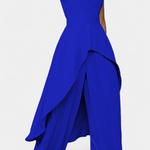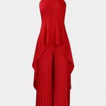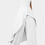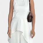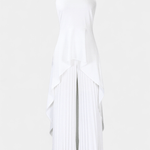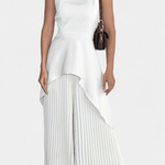 • Silhueta e movimento: Calças largas e plissadas caem suavemente com uma expressão de drapeado arejado, que completa os ombros estruturados da blusa.