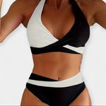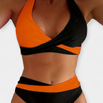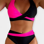 Este sexy biquíni de dois peças impressiona com a sua linha simples e o detalhe cruzado no decote. Realça a feminilidade de forma discreta, ideal para aparições elegantes na praia ou nas suas escapadas de verão.