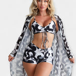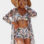 Este conjunto moderno combina conforto, estilo e elegância para looks de verão completos. O biquíni de cintura alta abraça a silhueta, o top com laço realça o busto, enquanto a leve roupa de praia adiciona sofisticação e versatilidade.
