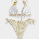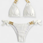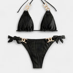 Moderno e sedutor, este biquíni de dois peças impressiona com o tecido riscado em relevo e os detalhes dourados em anel e corrente. O decote halter e o top triangular acentuam o busto, enquanto o laço lateral adiciona um caráter brincalhão – ideal para piscina ou praia com estilo.