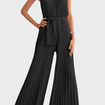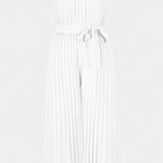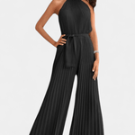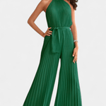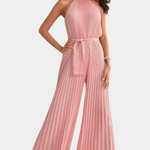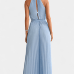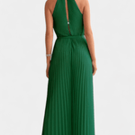 • Silhueta e movimento: Tecido plissado, corte Palazzo e decote halter criam movimento e extensão visual.