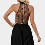 • Construção artesanal: Construído de forma artesanal com um corpete estruturado, halterneck e delicados bordados florais em material transparente, que criam uma silhueta sofisticada e durável.