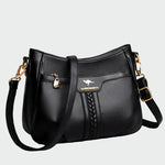 Elegante bolsa feminina tiracolo em tom preto, fabricada em couro sintético de alta qualidade e durabilidade. Apresenta um discreto detalhe trançado ao centro que confere personalidade única, enquanto os elementos metálicos dourados adicionam um toque de luxo. A alça ajustável oferece um encaixe confortável, tornando-a a escolha ideal para qualquer hora do dia.