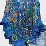 Karen | Azul Artístico eleva o seu outfit através de um espírito artístico evidente e do artesanato dinamarquês. O fundo azul claro destaca padrões abstratos vibrantes, que lembram pinturas numa tela e testemunham a consideração em cada corte. Com mangas em babados e um corte relaxado, une elegância e liberdade de movimento, conferindo um toque sofisticado tanto a looks do dia a dia como a ocasiões mais formais. Esta peça é mais do que moda; carrega uma estética intemporal e um legado de atenção aos detalhes e qualidade, que proporciona à sua guarda-roupa um valor duradouro e um carácter de colecionador distinto.