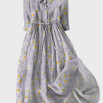Este encantador vestido longo em suave tom de lilás é a escolha ideal para um visual fresco e primaveril. O seu discreto padrão com margaridas em branco e amarelo confere uma atmosfera leve e alegre, enquanto o cinto na cintura proporciona um ajuste perfeito.