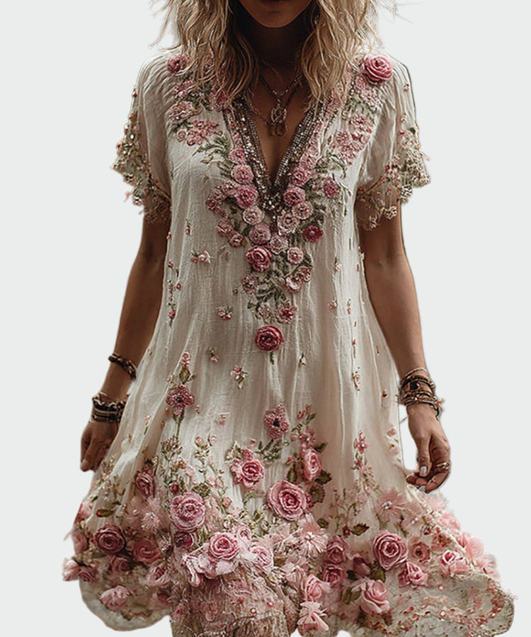 Vestido em estilo Vintage com mangas curtas e Elegante Bordado Floral