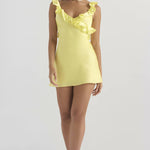 Um vestido mini divertido e feminino que combina elegância e frescura. O detalhe assimétrico com as ruffles no decote confere um movimento e estilo únicos, enquanto o corte justo destaca a silhueta da forma mais atraente. Ideal para noites de verão e saídas elegantes.