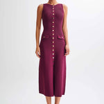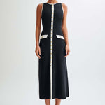 Vestido elegante de malha sem mangas com botões ao longo de todo o comprimento. A sua linha reta confere uma elegância atemporal, enquanto os bolsos com botão adicionam um detalhe requintado. Ideal para looks do manhã até à noite.