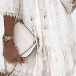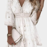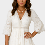 Abrace a elegância atemporal com este lindamente desenhado vestido mini de renda. Apresenta uma delicada renda bordada, um decote em V feminino e mangas largas – ideal para ocasiões especiais, encontros de verão ou aparições de noiva.