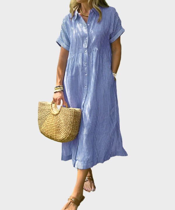 Vestido Camisa Listrado com Penas, Botões e Bolsos Funcionais