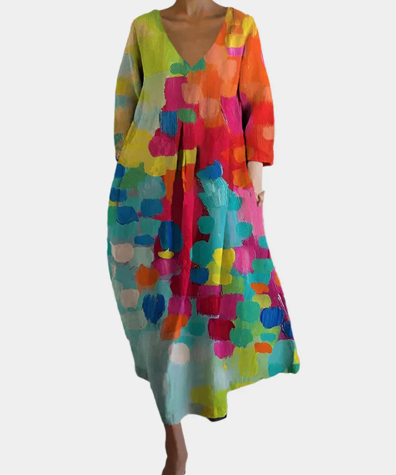 Vestido Longo com Padrões Geométricos e Linha Moderna
