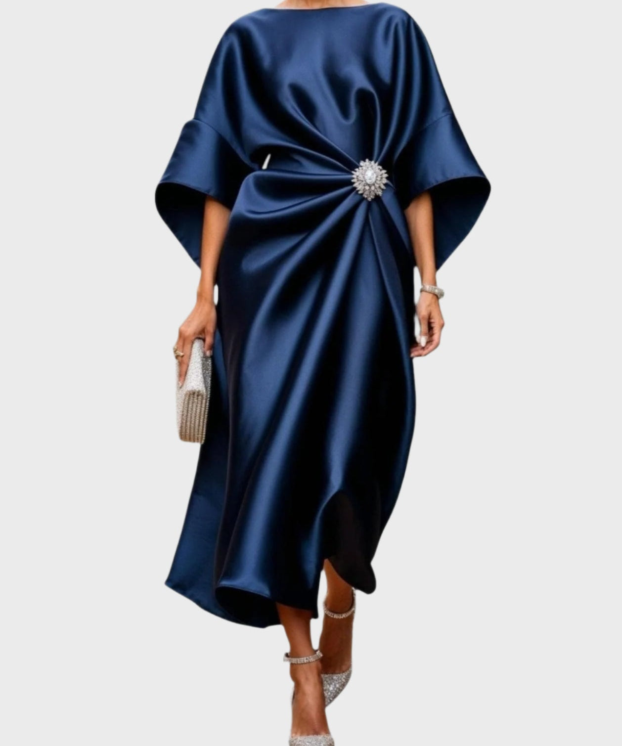 Vestido de Cetim com Pregas Laterais e Fivela Decorativa