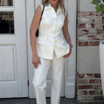 Henriette | Conjunto combina a arte da alfaiataria intemporal com um brilho discreto. O conjunto é composto por um colete estruturado e calças largas, que juntas criam uma silhueta forte e elegante. O tecido leve, na cor marfim, é respirável e resistente a rugas, proporcionando calor sofisticado sem pretensiosidade. Como um investimento na tradição de Portofino, o conjunto Henriette Portofino oferece conforto ao longo do dia e é perfeito para o escritório, noites de verão e fins de semana sofisticados. A quantidade limitada sublinha a exclusividade sem comprometer a funcionalidade.